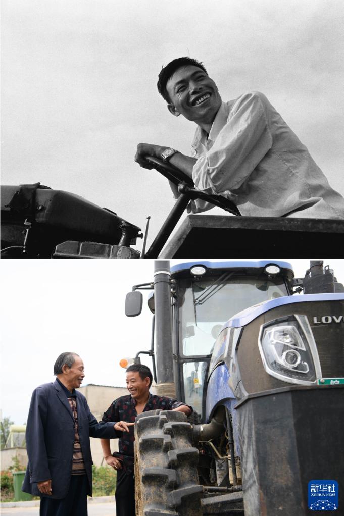 拼版照片:严宏昌在村里第一个买了拖拉机(上图,资料照片);2024年9月26日,严宏昌(左)和二儿子严德宝在家中院子里的一台大型拖拉机旁交流(下图,新华社记者张端摄)。