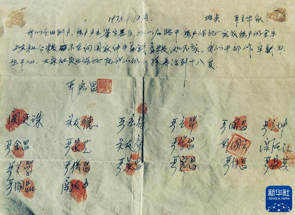 这是小岗村农民按下红手印的“包产到户”契约(资料照片)。