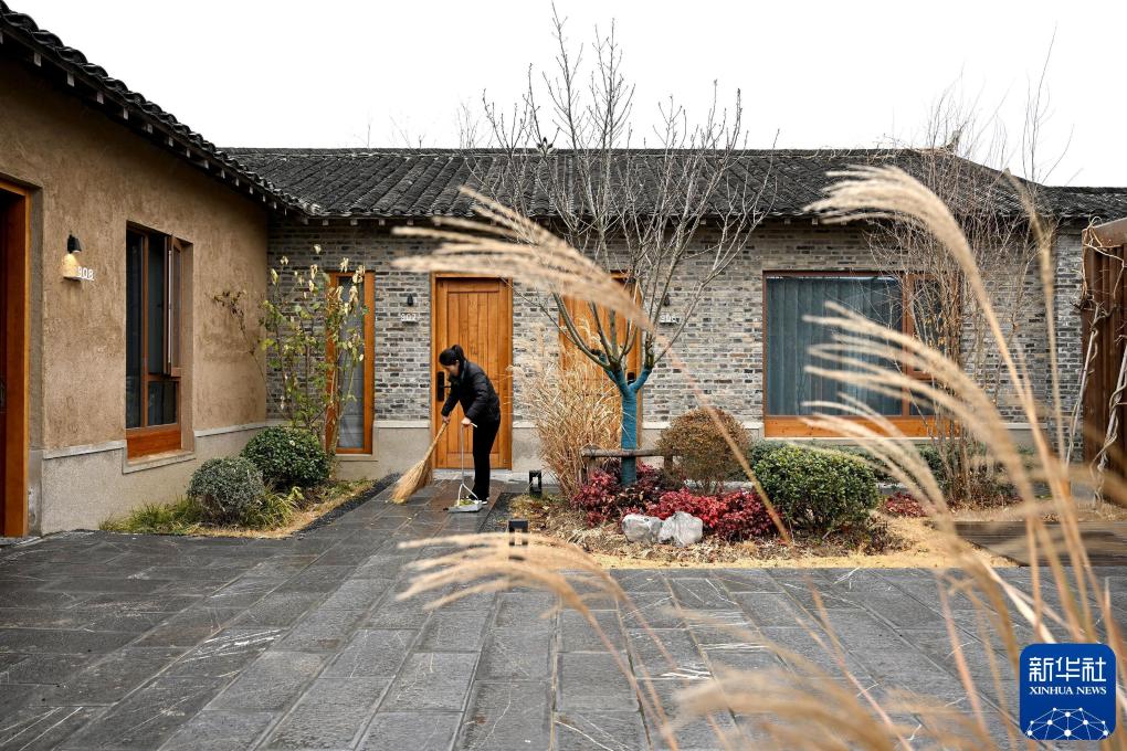 2025年1月24日,小岗村宿工作人员朱小慢在打扫客房院落。新华社记者 黄博涵 摄
