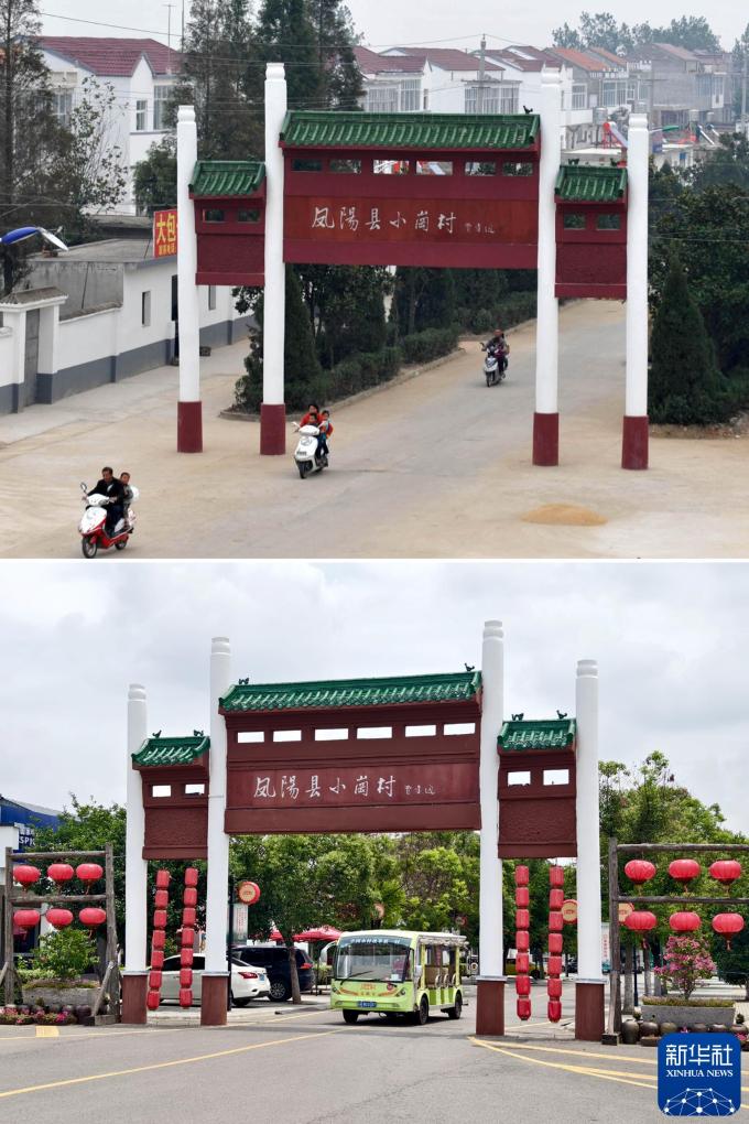 拼版照片:2008年10月8日拍摄的小岗村村舍俨然,道路平整(上图,新华社记者王雷摄);2024年6月26日拍摄的小岗村门楼(下图,新华社记者郭晨摄)。