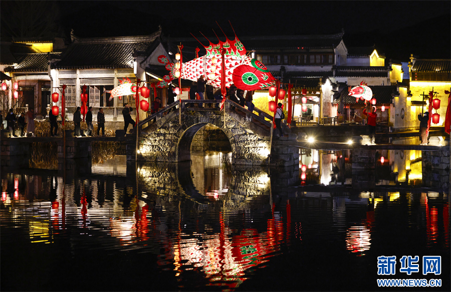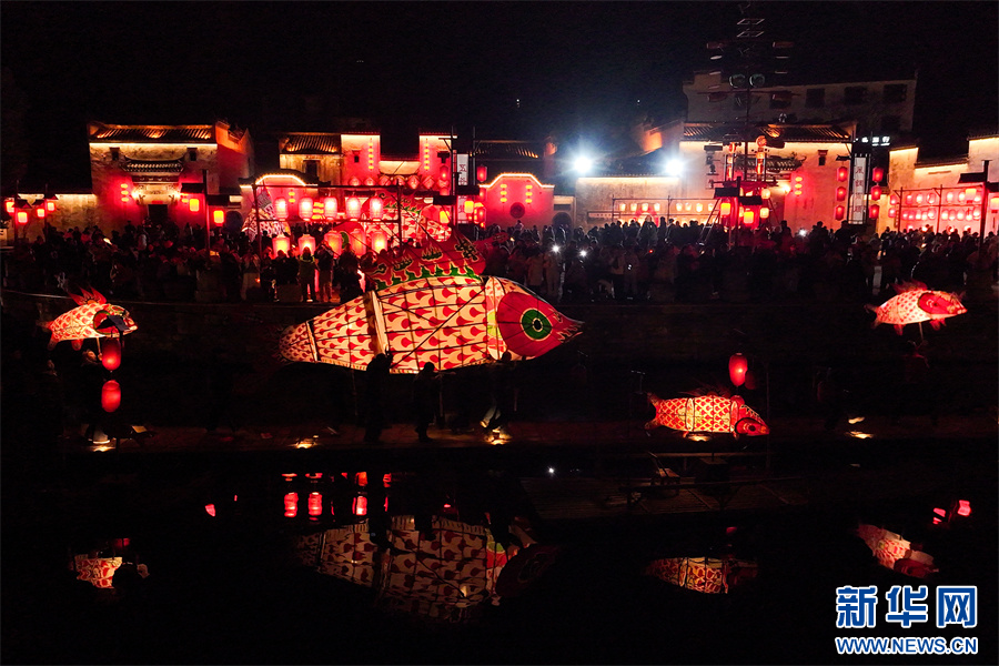 当日是农历正月初九,非遗民俗“汪满田鱼灯”在安徽省黄山市徽州区呈坎古村巡游表演,吸引了众多游客观赏体验。新华网发(施亚磊 摄)