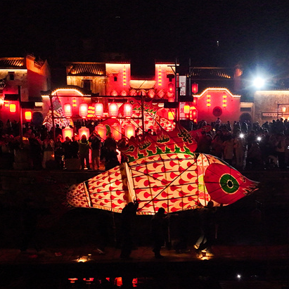 2月6日,非遗民俗“汪满田鱼灯”在安徽省黄山市徽州区呈坎古村巡游。