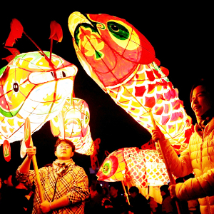 民间艺人和学校师生舞动鱼灯