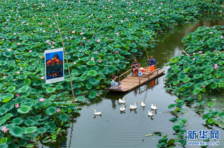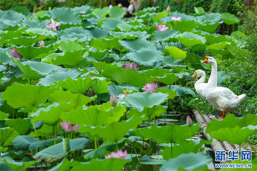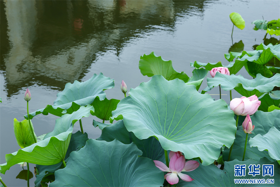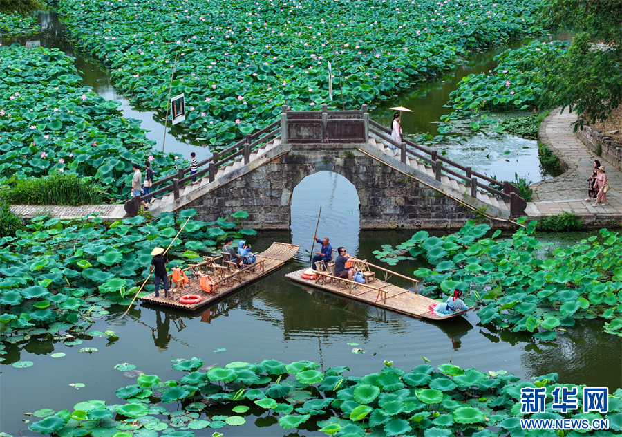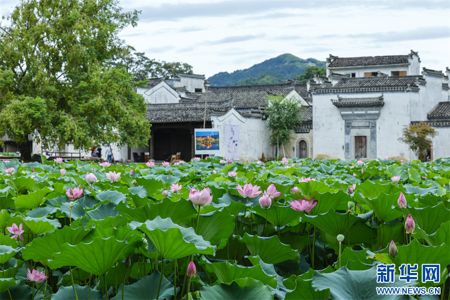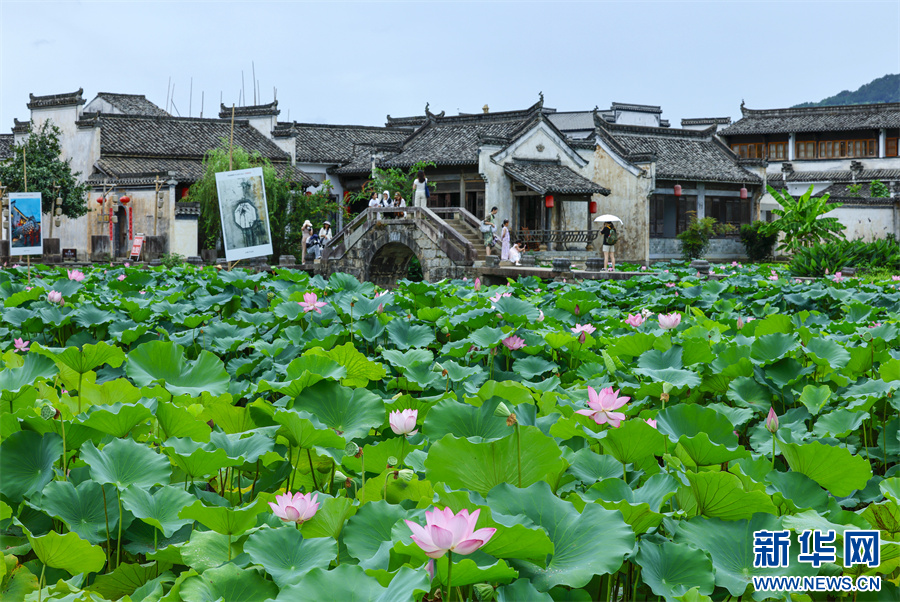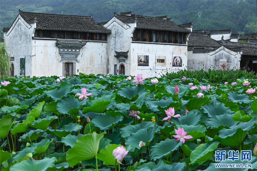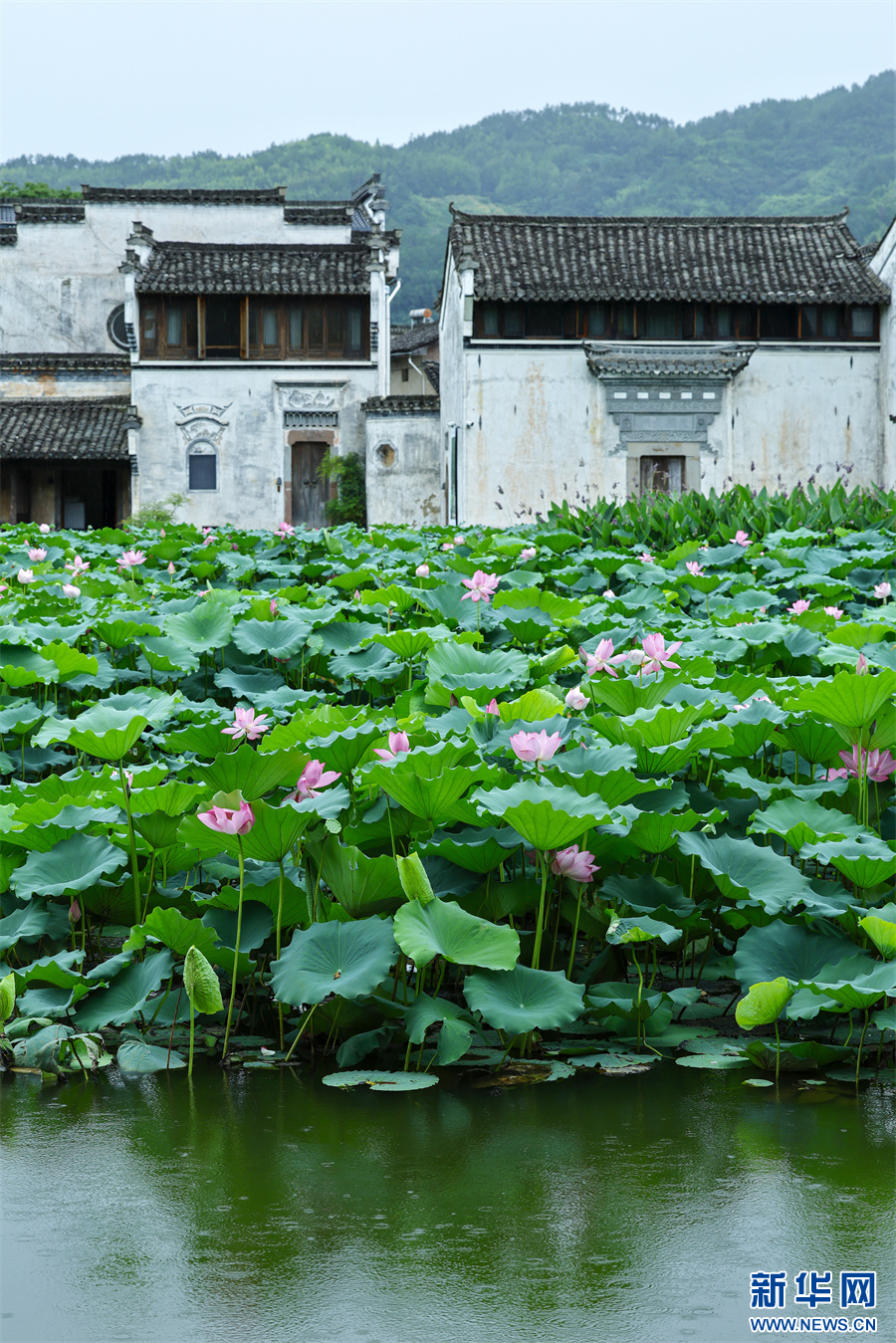 大暑时节,安徽省黄山市徽州区呈坎古村永兴湖内的荷花盛放,亭亭玉立,娇艳欲滴,与粉墙黛瓦的徽派民居相映成趣,构成一幅清新雅致的夏日画卷,吸引众多游客前来游玩。新华网发(施亚磊 摄)