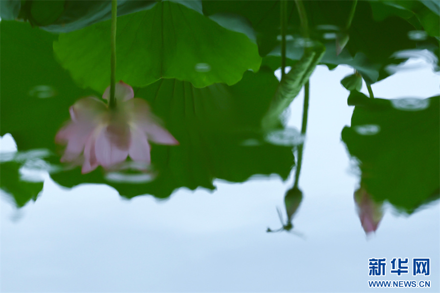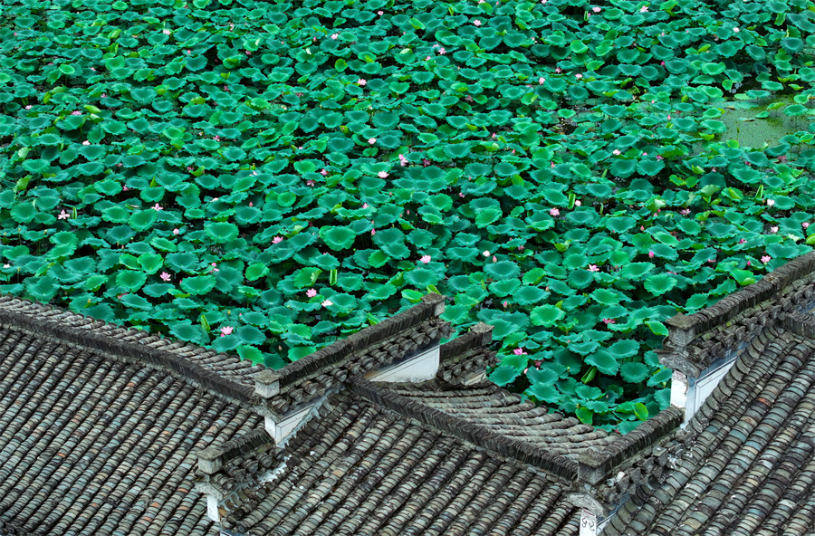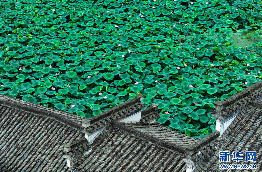 7月22日,在安徽省黄山市徽州区呈坎古村落拍摄的荷花美景。