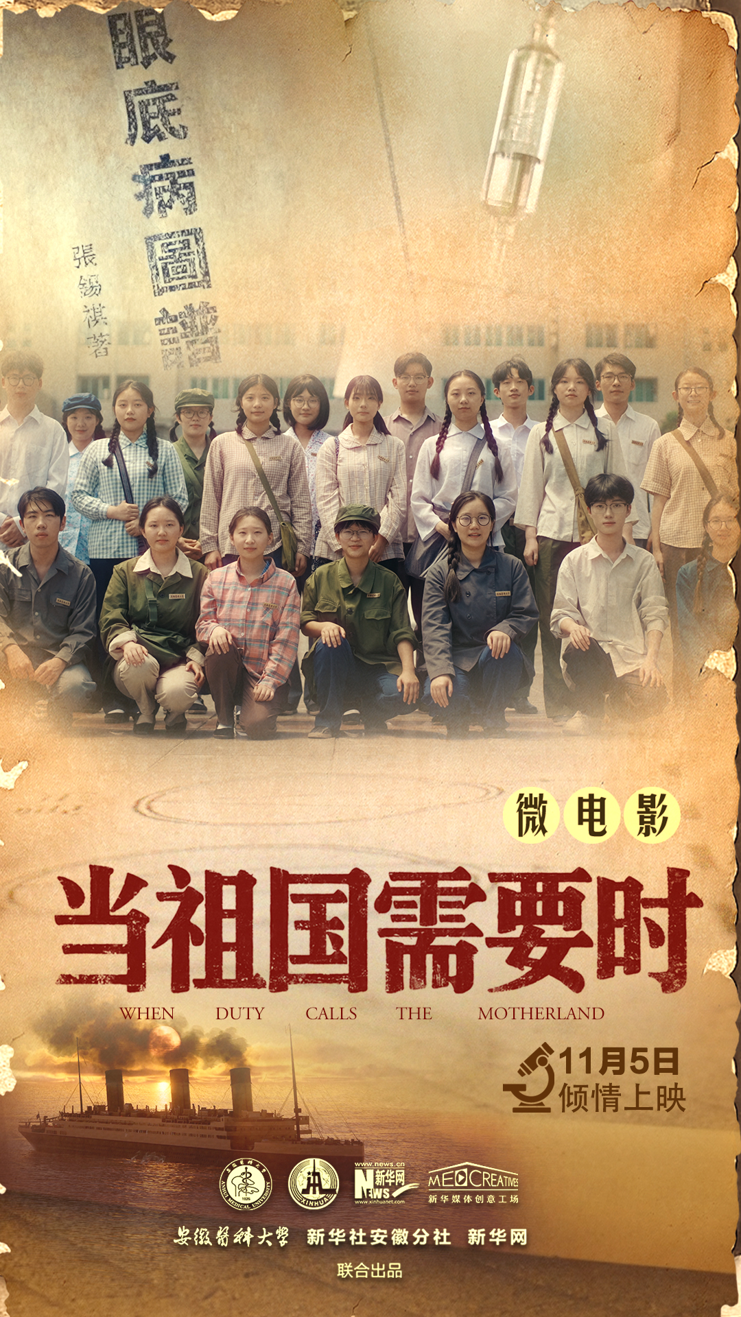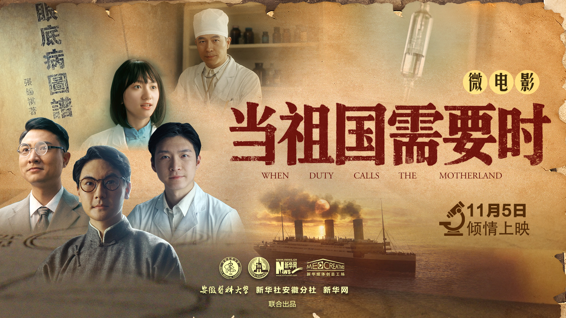 微电影《当祖国需要时》以郭琦元、张锡祺等安徽医科大学创校先驱们筚路蓝缕、宵衣旰食的奋斗历程,以及朱仲丽等知名校友投身革命的光辉事迹,以光影艺术重现百年校史脉络。影片采用“话剧排练+历史闪回”的叙事手法,通过现代学子与百年历史的时空对话,诠释不同年代学子的精神风貌,展现安徽医科大学百年来的文化积淀与教育成就。