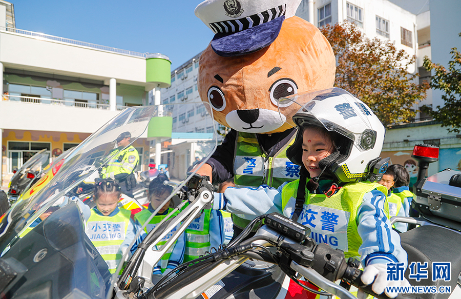 12月1日,在安徽省黄山市示范幼儿园,交警指导孩子们体验铁骑。