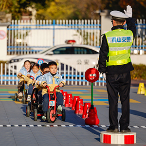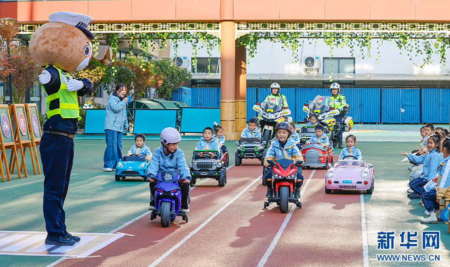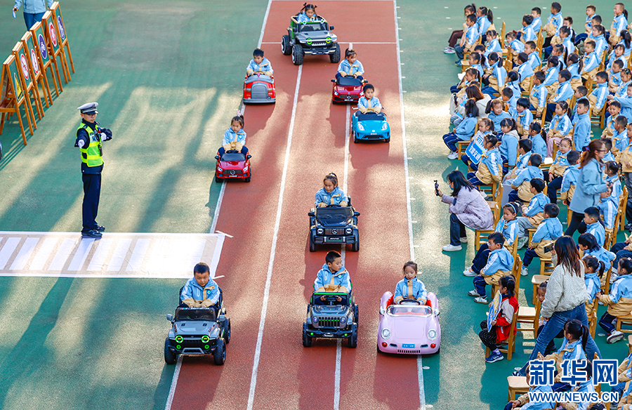 12月1日,在安徽省黄山市屯溪示范幼儿园,孩子们在交警的引导下体验道路安全驾驶。