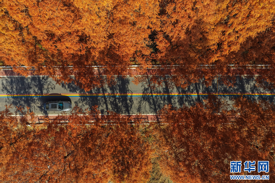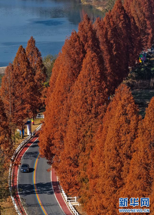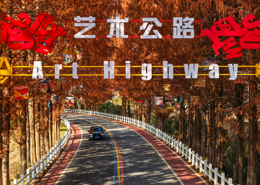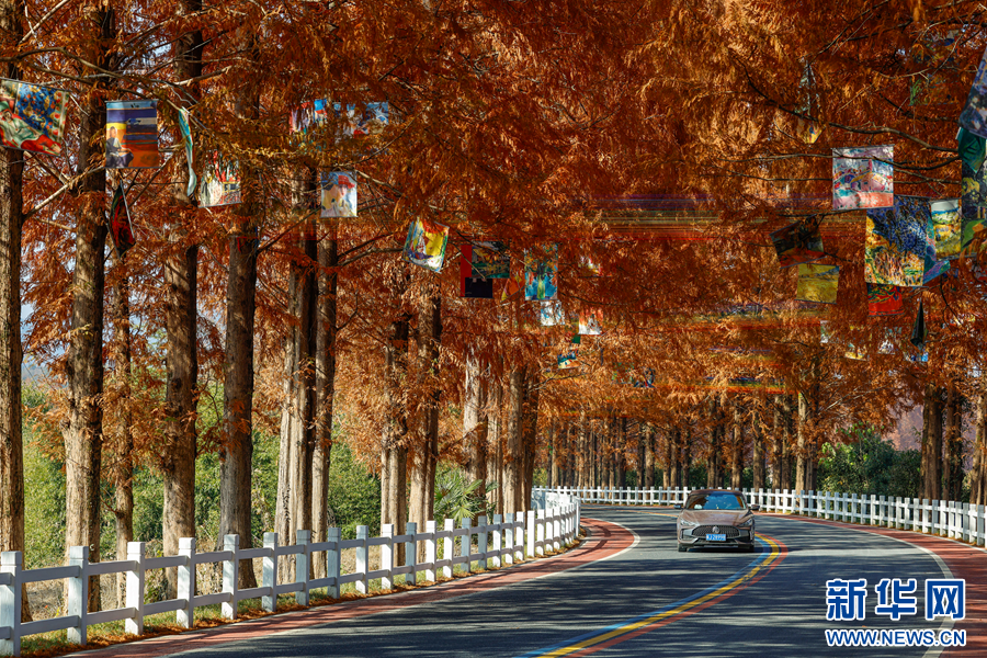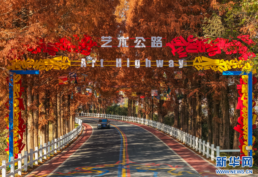 当日,安徽省黄山市休宁县齐云山镇的“艺术公路”两侧,成排的红杉树色彩缤纷,宛如一幅幅油画作品悬挂其间,车辆穿行而过,仿佛驶入一条天然的“流动画廊”,为游客带来“车行画中、人在景中”的旅行体验。