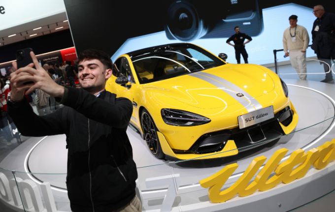 3月6日,在西班牙巴塞罗那举行的2025年世界移动通信大会上,一名男子和小米汽车留影。(新华社)