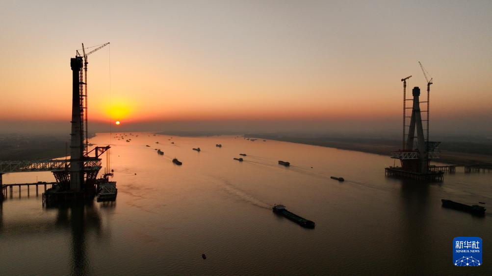 1月15日,封顶完成的池州长江公铁大桥南主塔影子倒映在长江江面上(无人机照片)。