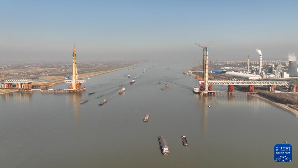 1月15日拍摄的池州长江公铁大桥施工现场。画面左侧为南主塔(无人机照片)。