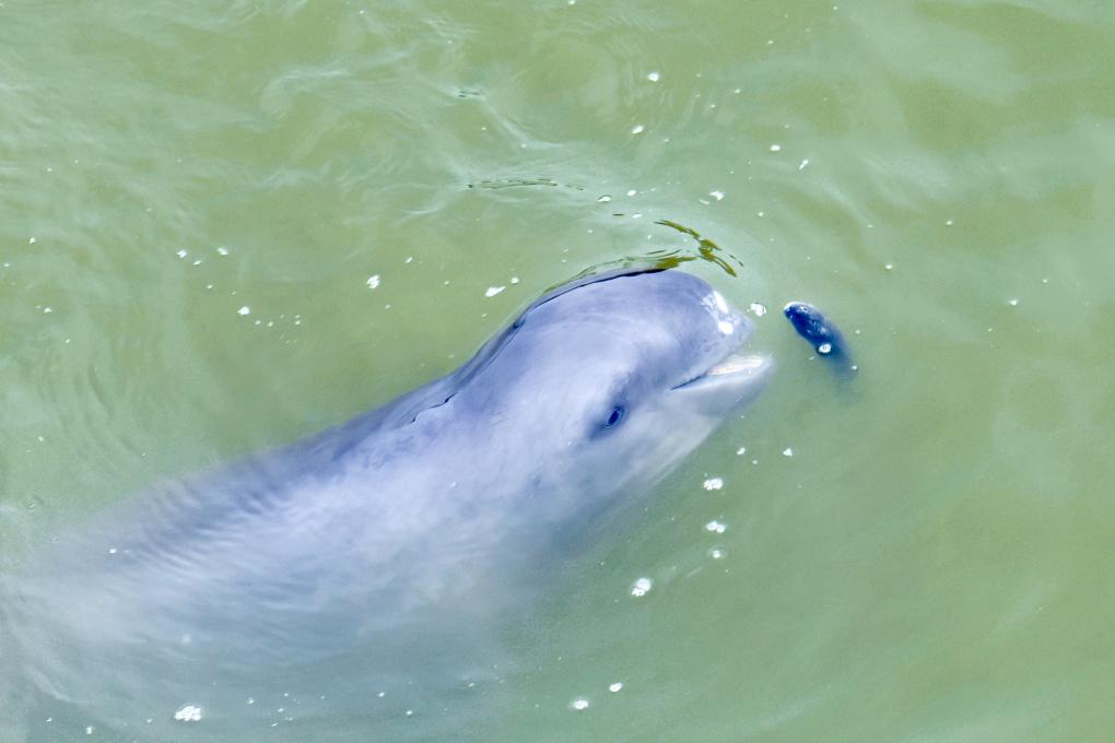 2023年6月15日,安徽省铜陵淡水豚国家级自然保护区内,一头江豚在张嘴吃鱼。(储著传 摄)