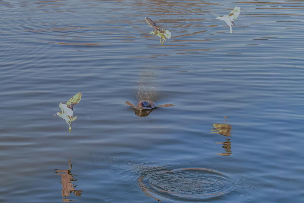 2026年1月14日,铜陵淡水豚国家级自然保护区内,一头江豚与几只鹭鸟同框。(储著传 摄)