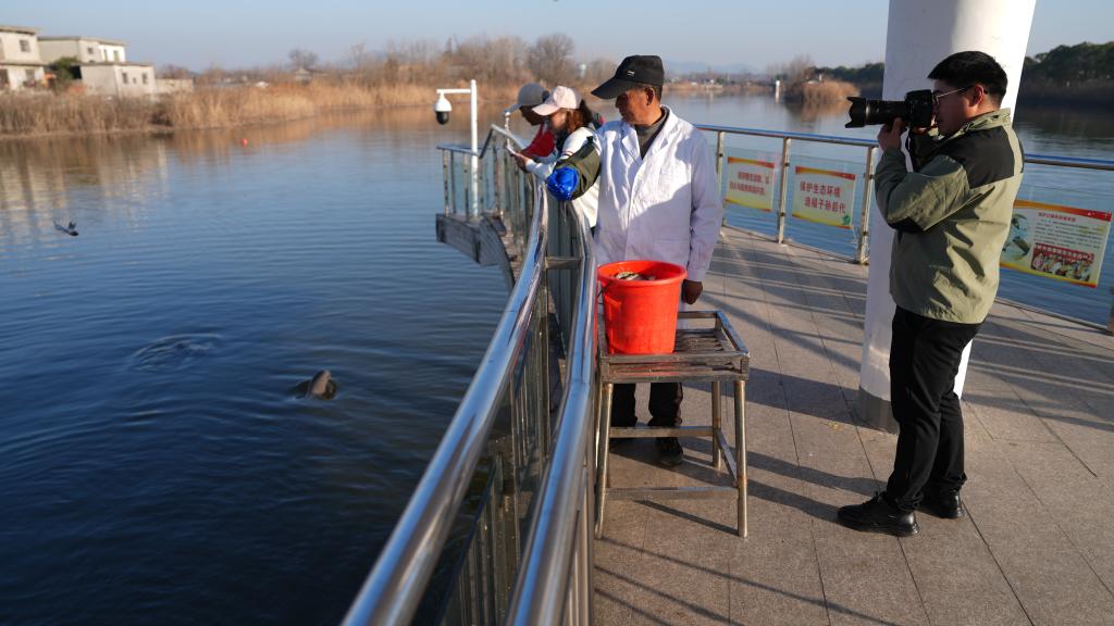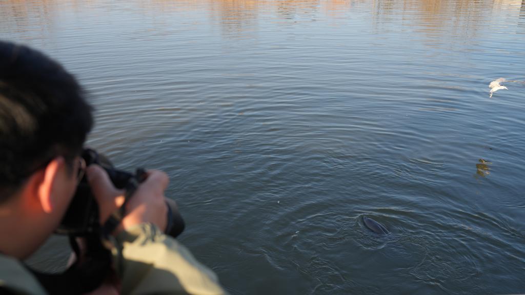 2026年1月14日,储著传在安徽省铜陵淡水豚国家级自然保护区拍摄“江豚爸爸”张八斤给江豚补充饵料鱼。新华社记者 胡锐 摄