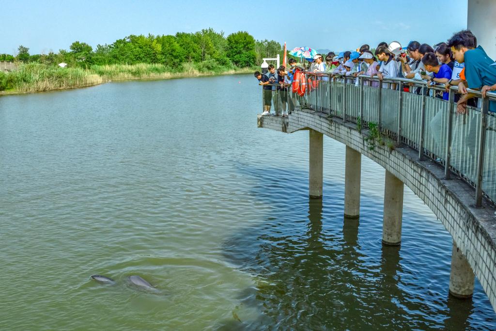 2025年5月19日,安徽省铜陵淡水豚国家级自然保护区内,来自合肥的研学游学生在参观江豚。(储著传 摄)