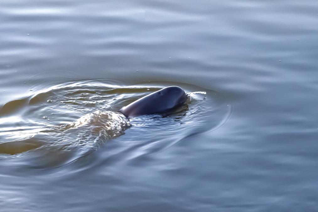 2023年7月23日,安徽省铜陵淡水豚国家级自然保护区内,一只江豚正在水中捕鱼,畅快享受进食时光。(储著传 摄)