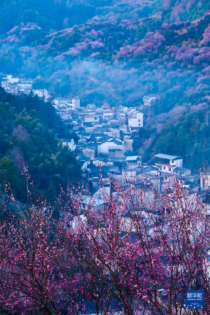 近日,在安徽省黄山市歙县雄村镇卖花渔村,漫山遍野的梅花绽放,花海与徽派村落民居相映成趣,景美如画。