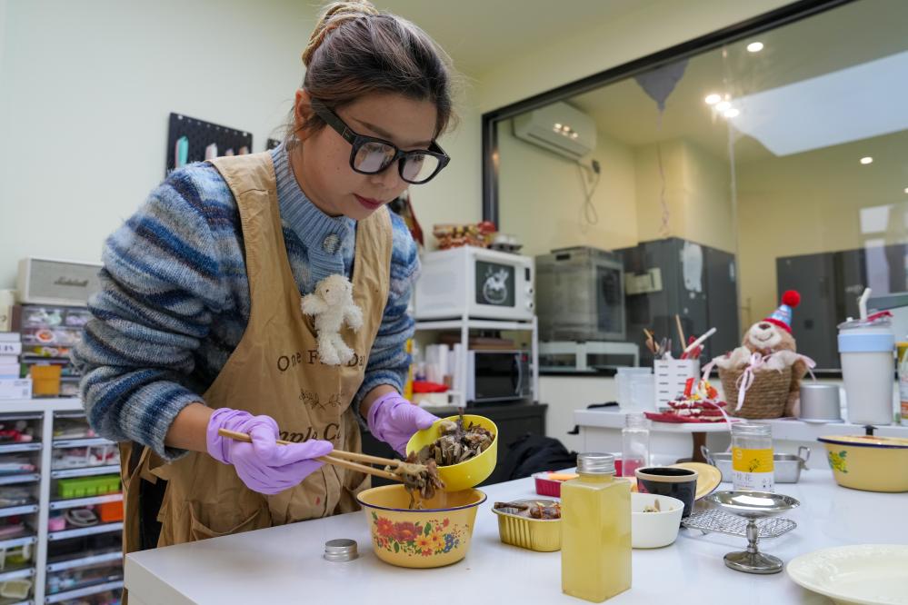 2月3日,宠物烘焙师丁一凡在制作宠物年夜饭的样品。