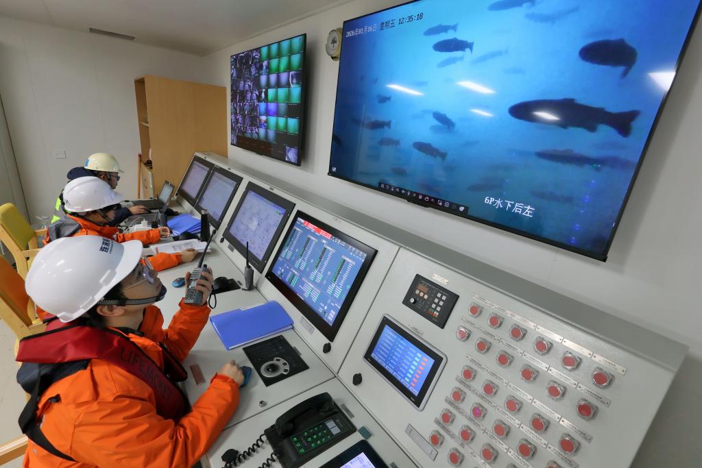 2026年1月16日,在山东港口烟台港,工作人员在集控室指挥三文鱼鱼苗装舱作业。新华社发(唐克摄)