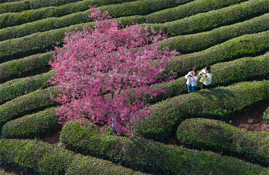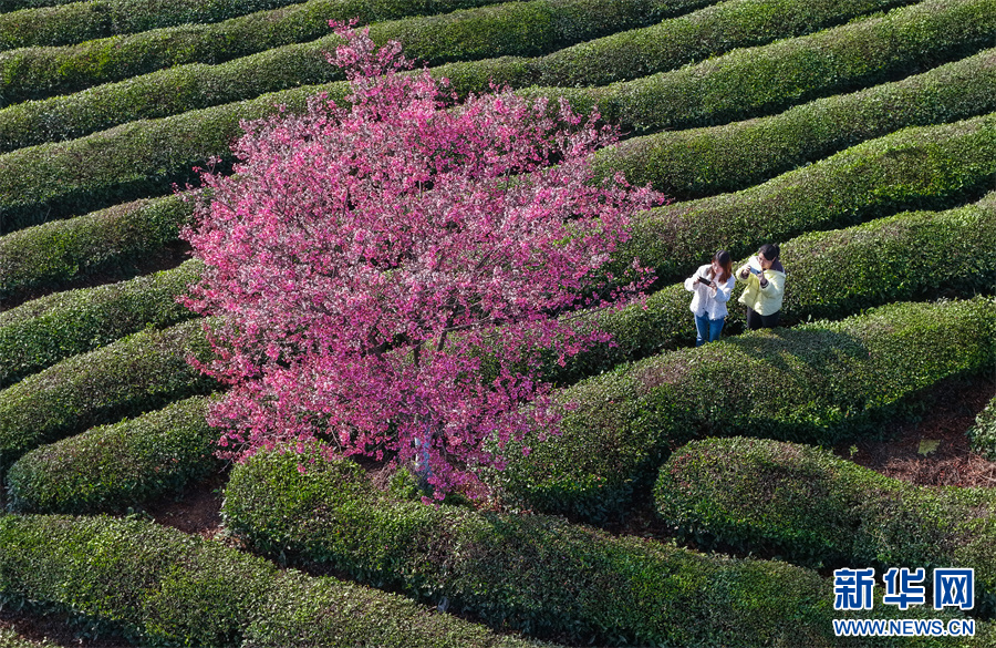 游客在欣赏缤纷的樱花茶园美景(无人机照片)。