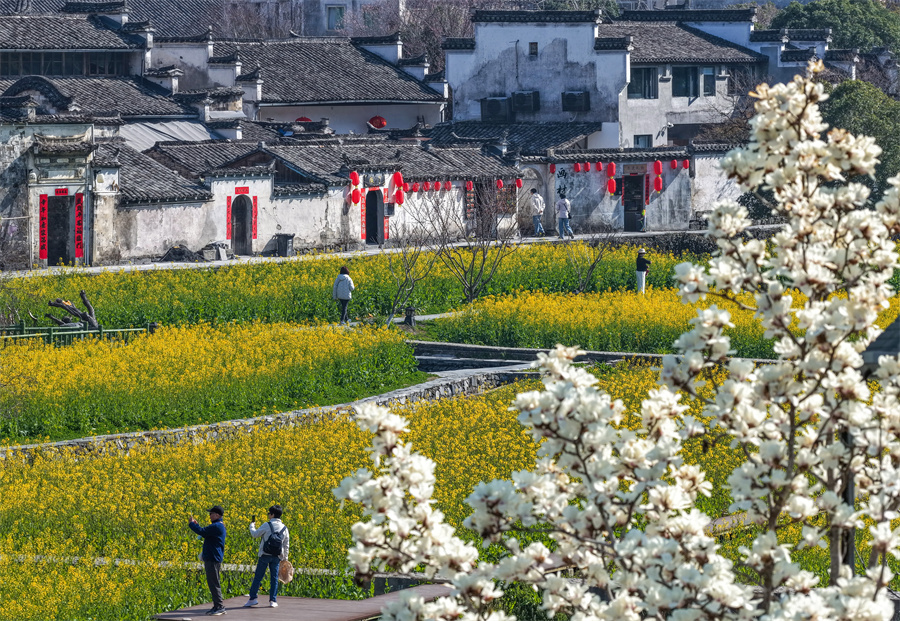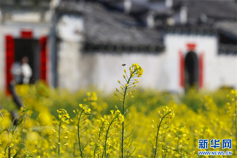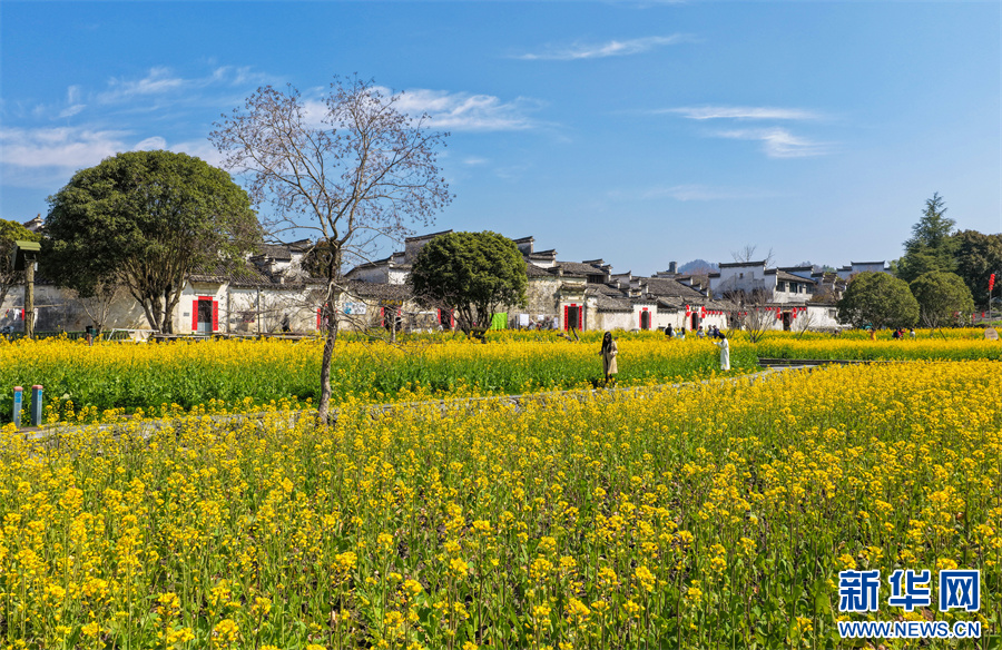 近日,安徽省黄山市黟县西递古村连片的油菜花渐次绽放,金黄的花海与鳞次栉比的徽派民居相映成趣,勾勒出一幅“花映古村”的春日画卷,吸引众多游客踏青赏花,感受皖南春色。新华网发(施亚磊 摄)