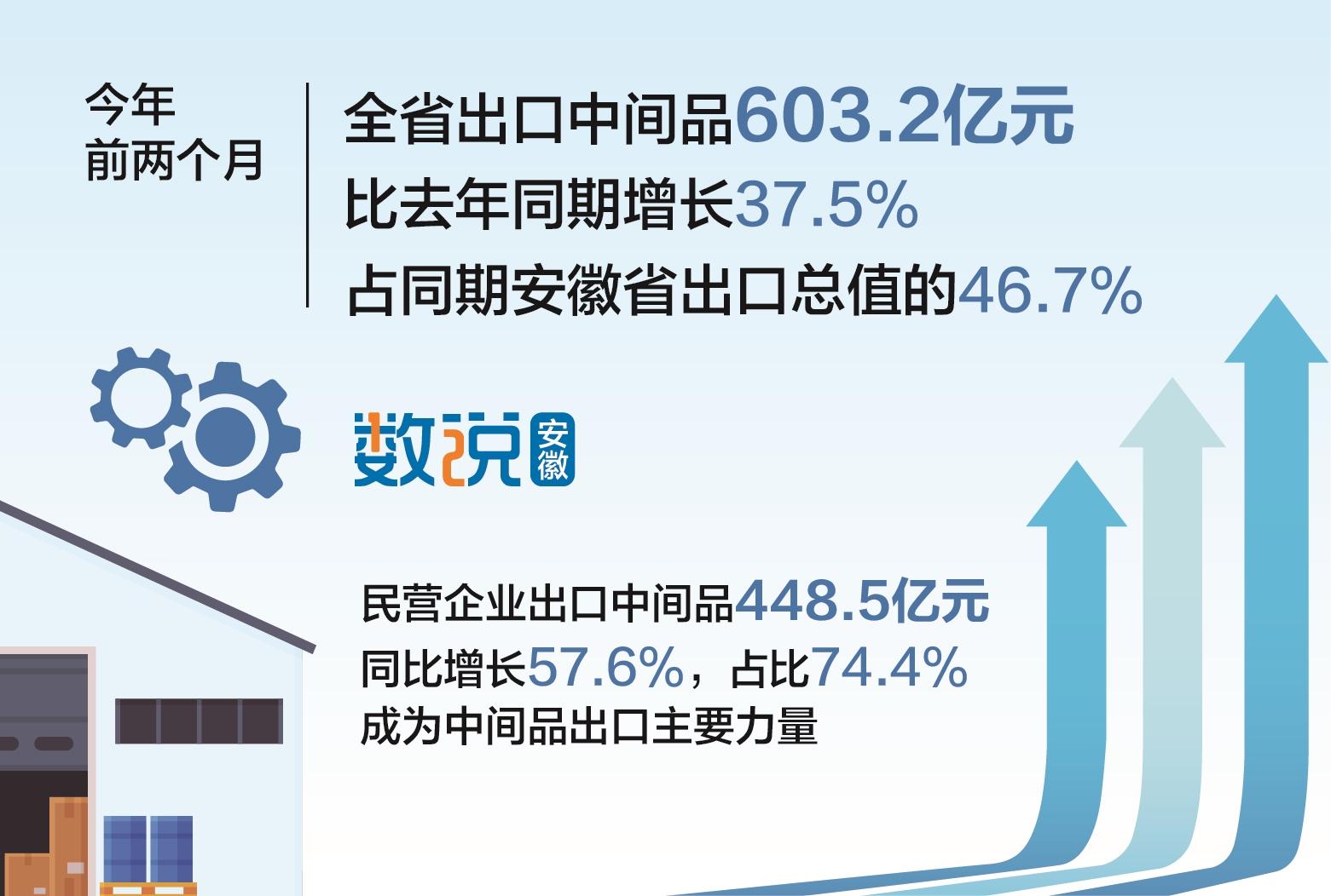 近日,合肥海关发布的统计数据显示,今年前2个月,安徽省出口中间品603.2亿元,比去年同期增长37.5%,占同期安徽省出口总值的46.7%。