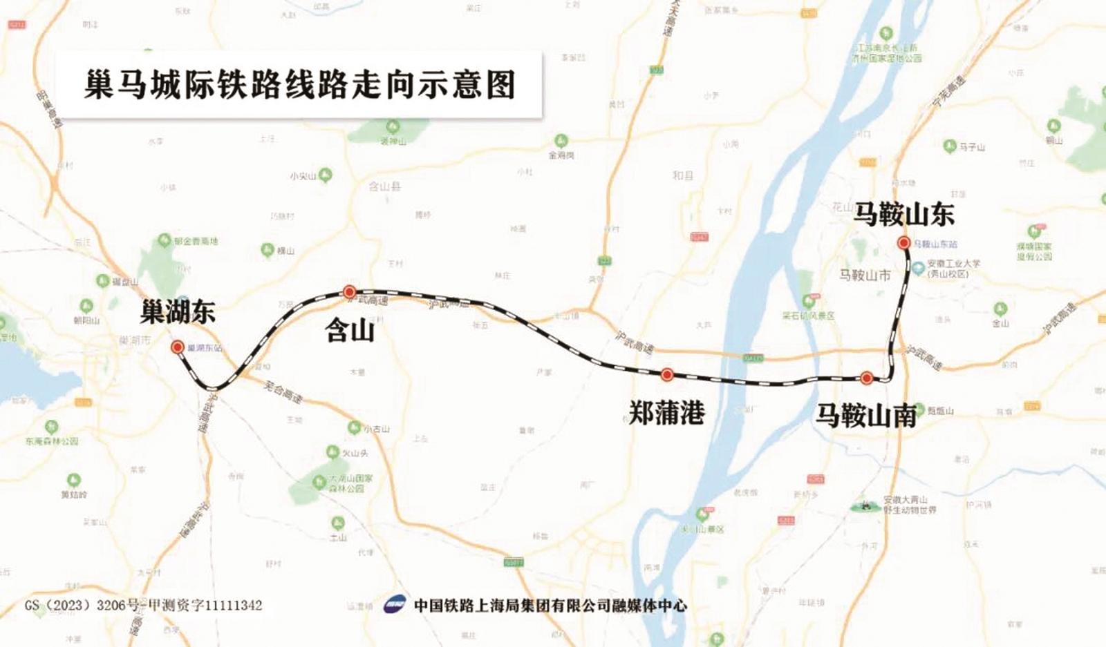 据介绍,巢马城际铁路北起巢湖东站,南至马鞍山东站,正线全长约61公里,设计时速350公里。全线共设巢湖东、含山、郑蒲港、马鞍山南、马鞍山东5座车站,其中含山、郑蒲港、马鞍山南为新建车站。“巢马城际铁路在巢湖东站连接合杭高铁,在马鞍山东站连接宁安高铁,是马鞍山与安徽省会合肥的直接连接线。”据上铁集团的相关人士介绍,该项目建成运营后,将在皖江两岸建起一条快速新通道,对进一步拉近合肥都市圈与南京都市圈之间的时空距离,打造“轨道上的长三角”,完善区域路网布局,服务长三角一体化发展和长江经济带发展等具有重要意义。(图片由上铁集团提供)